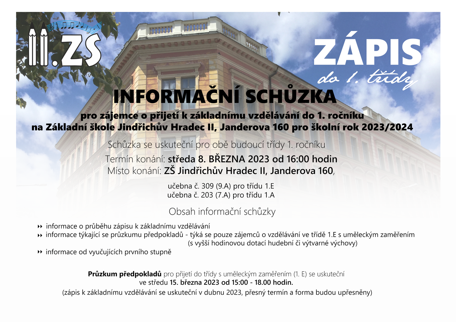 srdečně Vás zveme na informační schůzku k zápisu do 1. ročníku školního roku 2023/2024, která se koná ve středu 8. března 2023 od 16:00 hodin v hlavní budově školy – více informací naleznete na této pozvánce zde. Obsahem schůzky budou zejména informace o průběhu zápisu k základnímu vzdělávání a pro zájemce o přijetí do třídy s uměleckým zaměřením (1. E) s navýšenou hodinovou dotací hudební či výtvarné výchovy také informace týkající se průzkumu předpokladů.
