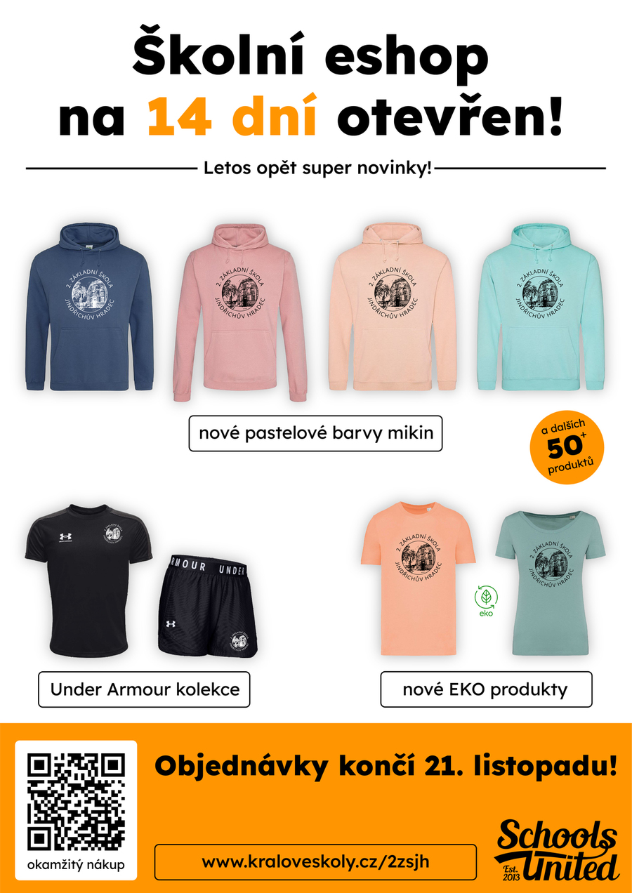 rádi bychom Vám touto cestou oznámili skvělou zprávu! Škola si opět nechala vytvořit svoji vlastní volnočasovou školní kolekci oblečení, jejíž náhled vidíte níže a kterou je možné si aktuálně pořídit na našem eshopu zde: https://www.kraloveskoly.cz/2zsjh/