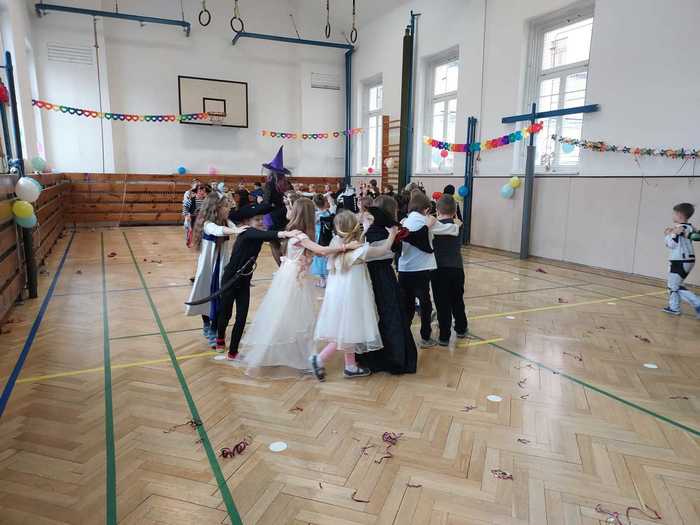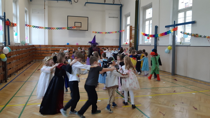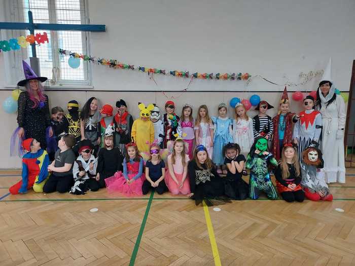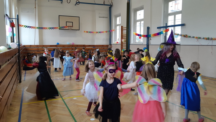 Karneval jsme zahájili promenádou všech masek a následně byly připraveny různé zábavné úkoly jako tanec s koštětem, tanec dvojic s míčkem nebo klobouková. Nechyběla ani oblíbená mašinka nebo ptačí tanec. Obě třídy také změřily své síly v soutěži přetahování lanem. Závěrem byly všem maskám předány sladké odměny a diplomy za účast.