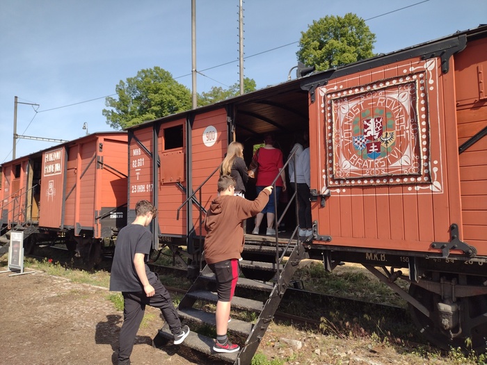 Hned první vyučovací hodinu jsme vyrazili v doprovodu paní učitelky J. Johnové a K. Karfíkové na nádraží v Jindřichově Hradci. Na začátku celé prohlídky jsme zhlédli film o 1. světové válce. Dále jsme postupovali s průvodcem do jednotlivých vagónů LEGIOVLAKU, vyprávěl nám o minulosti LEGIOVLAKŮ, o jejich využití a o hrozných podmínkách, kterými si lidé v té době museli projít. V posledním vagónu, který jsme navštívili, jsme si mohli zakoupit různé suvenýry.